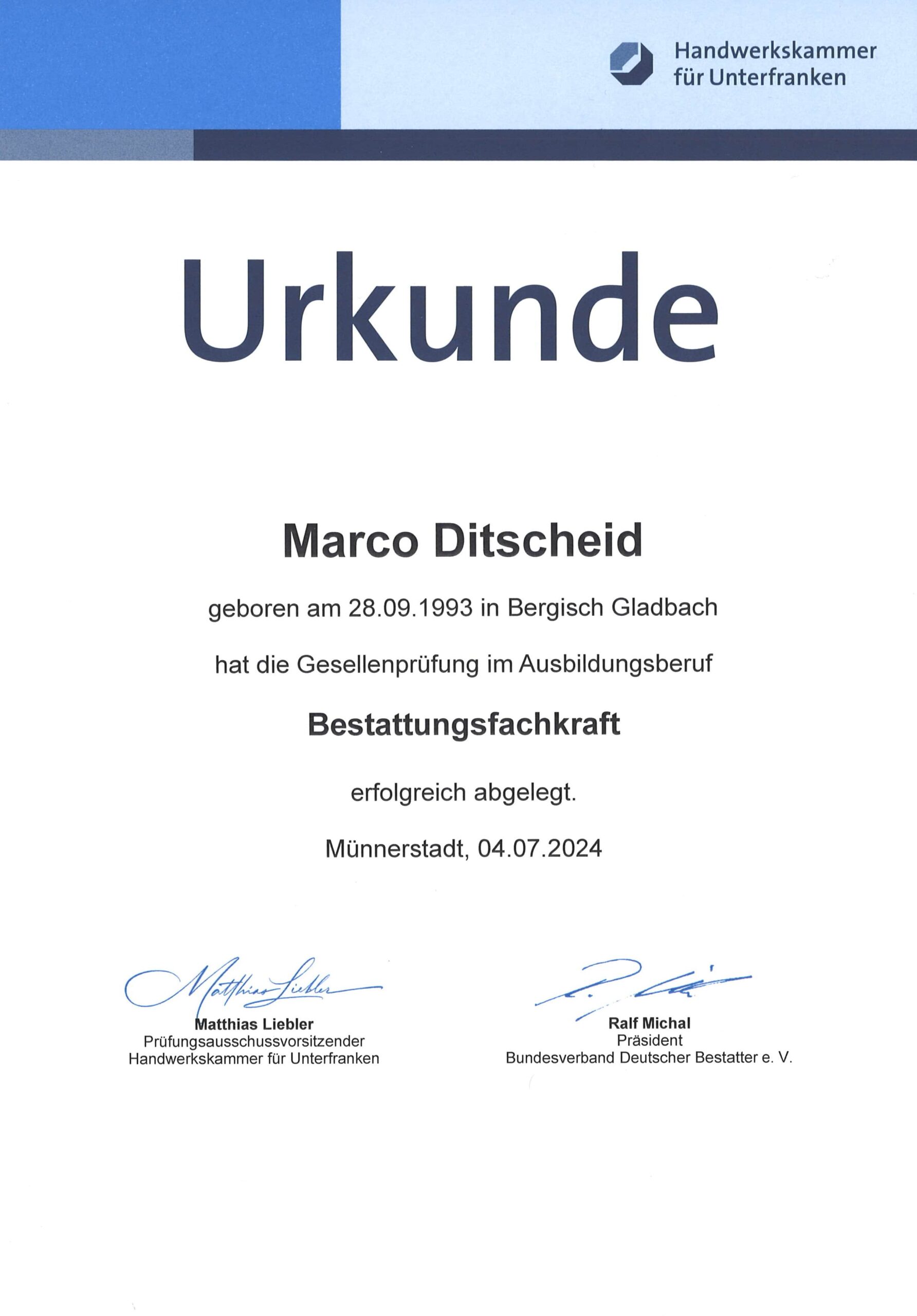 Zudem steht die nächste Generation bereit, um das Bestattungshaus fortzuführen. Marco Ditscheid (im Jahr 2024) und Nico Ditscheid (im Jahr 2021) haben ihre Gesellenprüfungen zur Bestattungsfachkraft bestanden und sind fester Bestandteil des Betriebs.